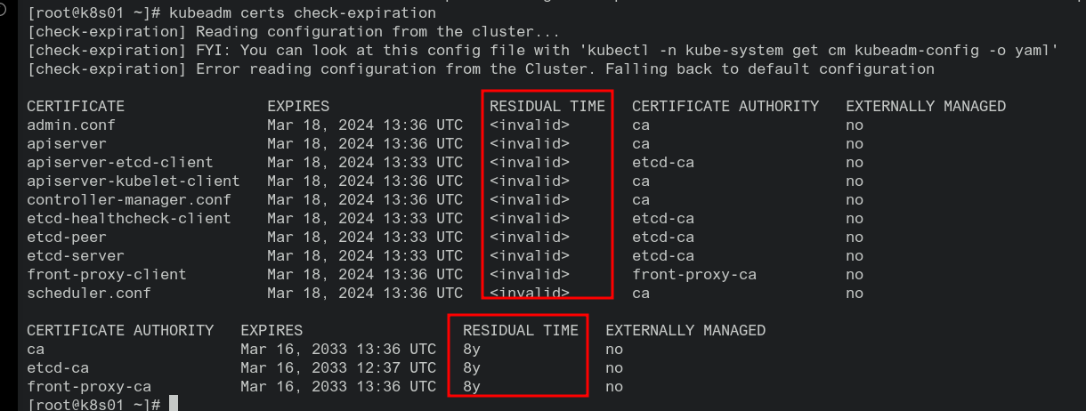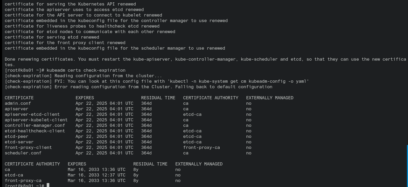 #备份 cp -R /etc/kubernetes/pki /tmp/pki_backup #在所有控制平面节点执行 [root@k8s01 ~]# kubeadm certs renew all [renew] Reading configuration from the cluster... [renew] FYI: You can look at this config file with 'kubectl -n kube-system get cm kubeadm-config -o yaml' [renew] Error reading configuration from the Cluster. Falling back to default configuration