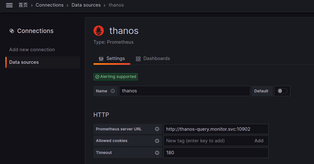 访问grafana,新增数据源prometheus,请求地址为query的 http://thanos-query.thanos.svc:10902